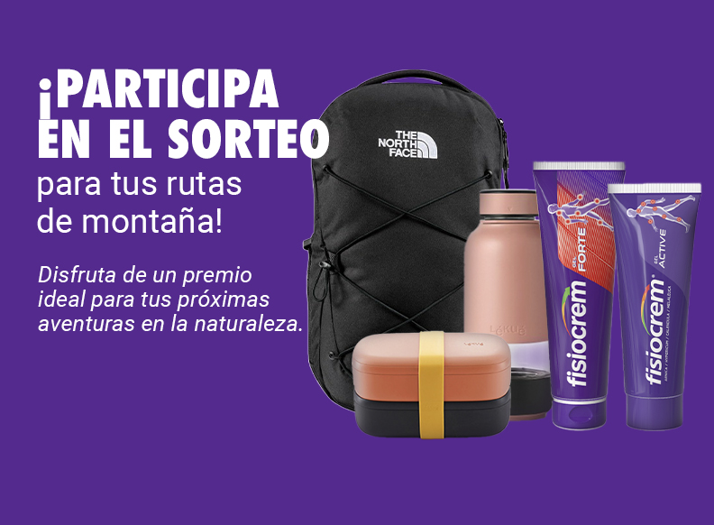 Gana este lote con productos Fisiocrem, ideales para cuidarte antes y después de cualquier actividad, una mochila The North Face para tus aventuras y un recipiente hermético y una cantimplora de Lékué para mantenerte hidratado y con energía.